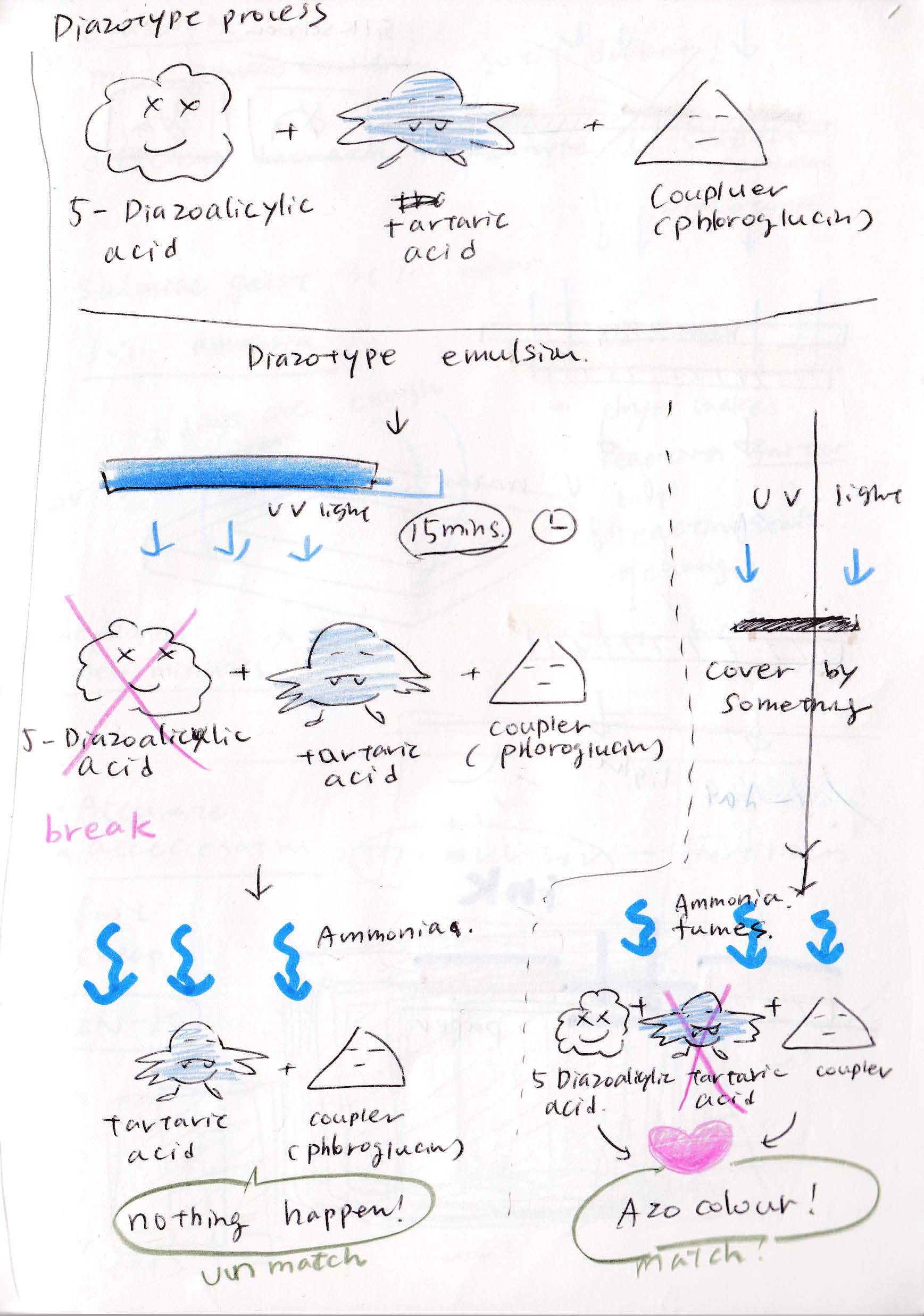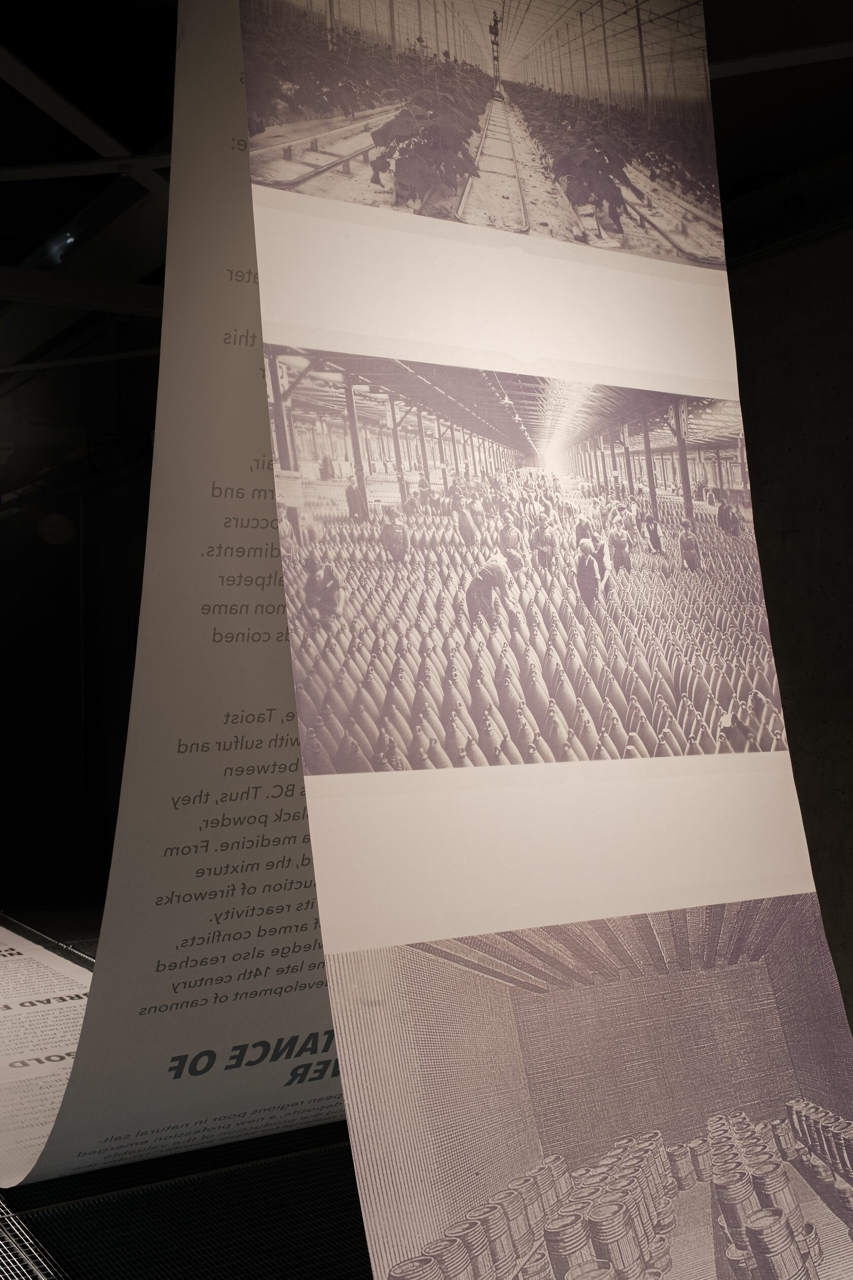 In the exhibition space in Rotterdam, Willimann/Arai presented a 14 meter long strip of diazotype machine print paper suspended from the ceiling. On one side of the paper strip, the audience could see diazotype prints of historical images, while on the other side a text retraced the history of human interaction with the element of nitrogen.