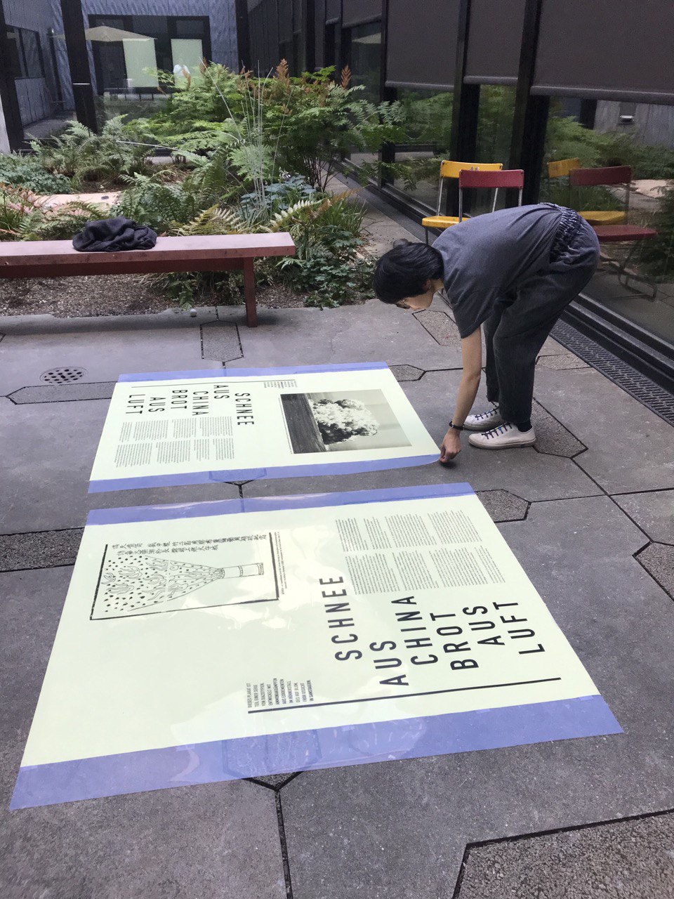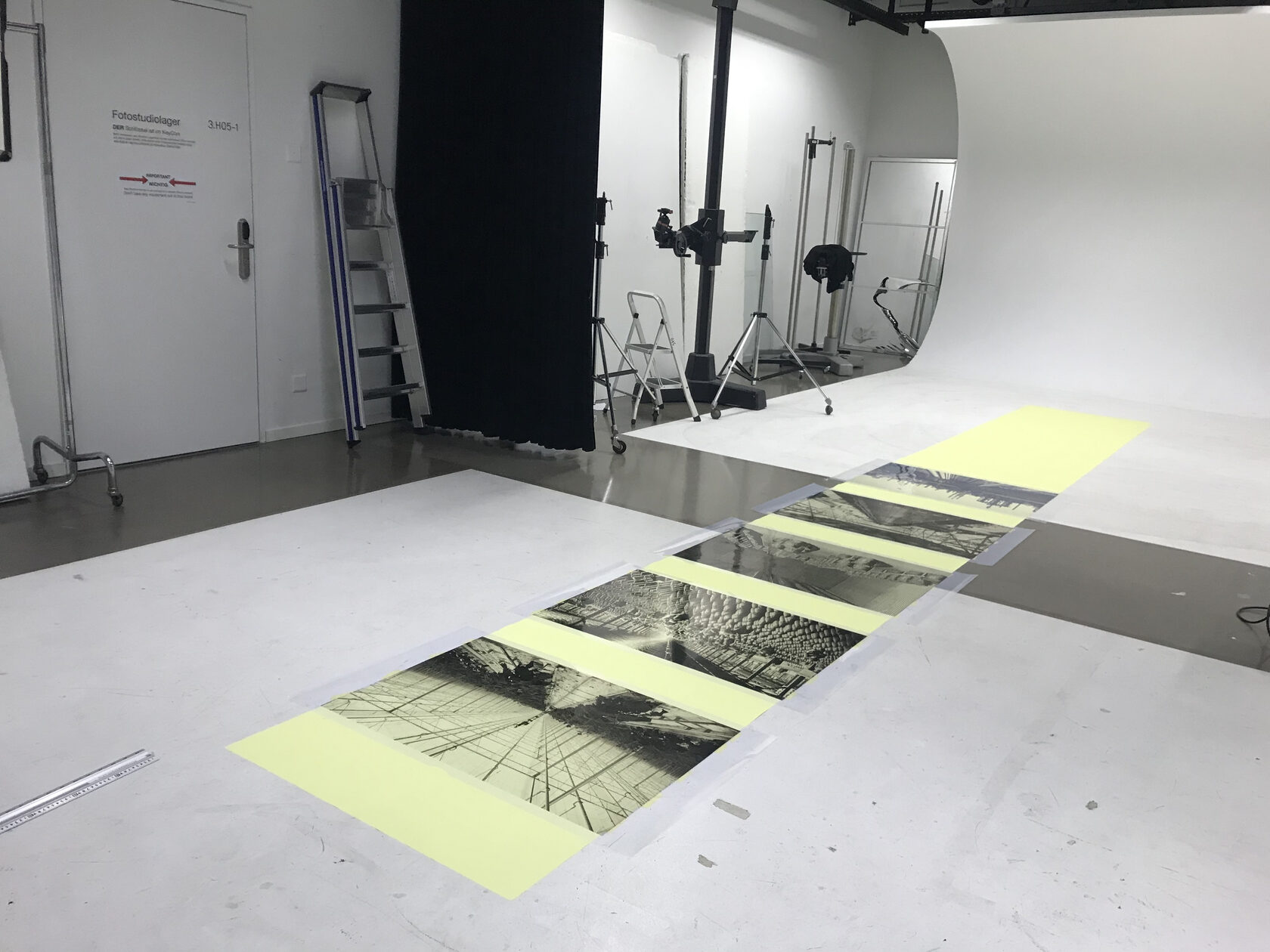 Production process: Paper strip for the Rotterdam exhibition with stencils, preparing for the exposure to sunlight. Photo: Willimann/Arai