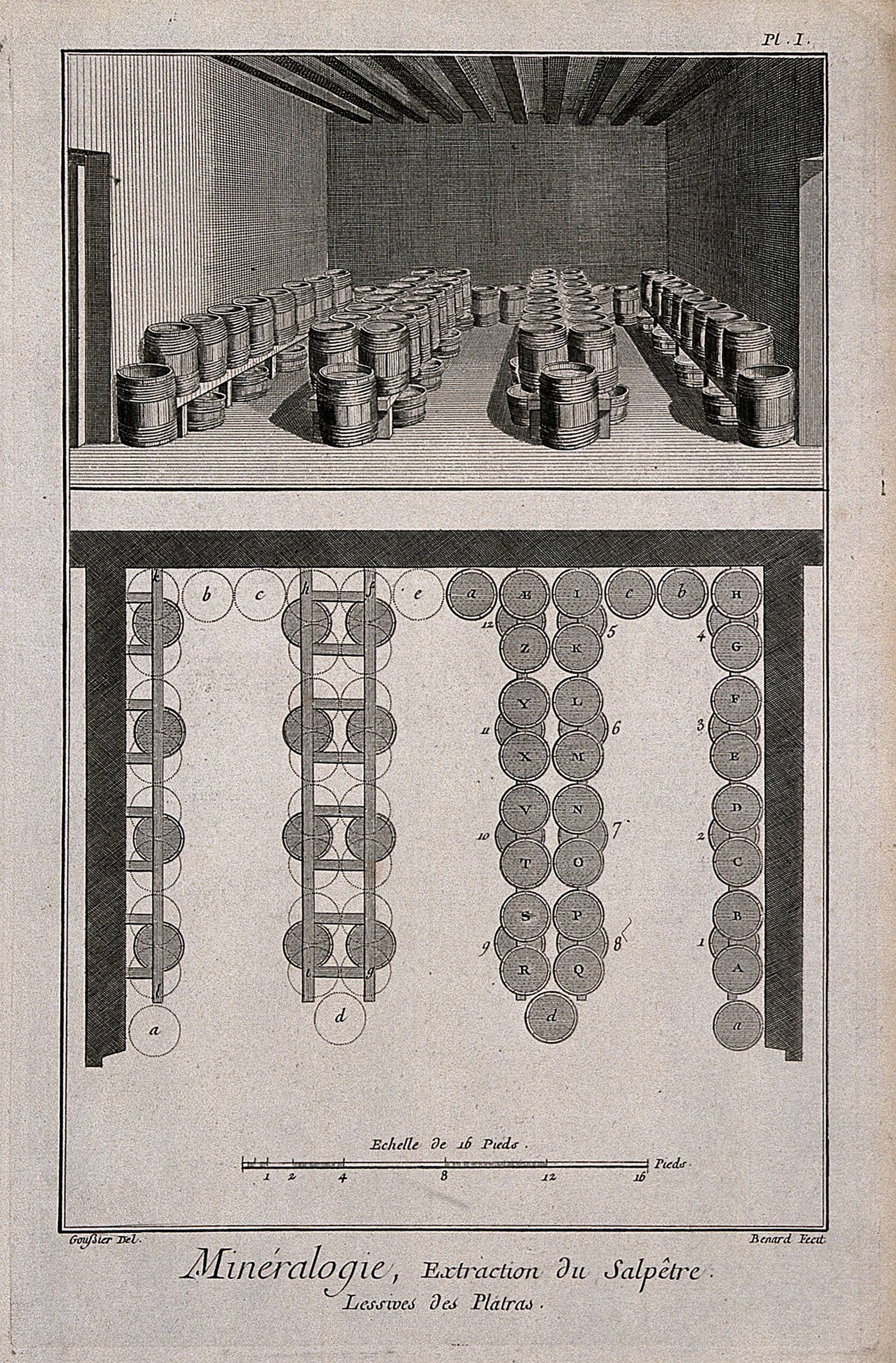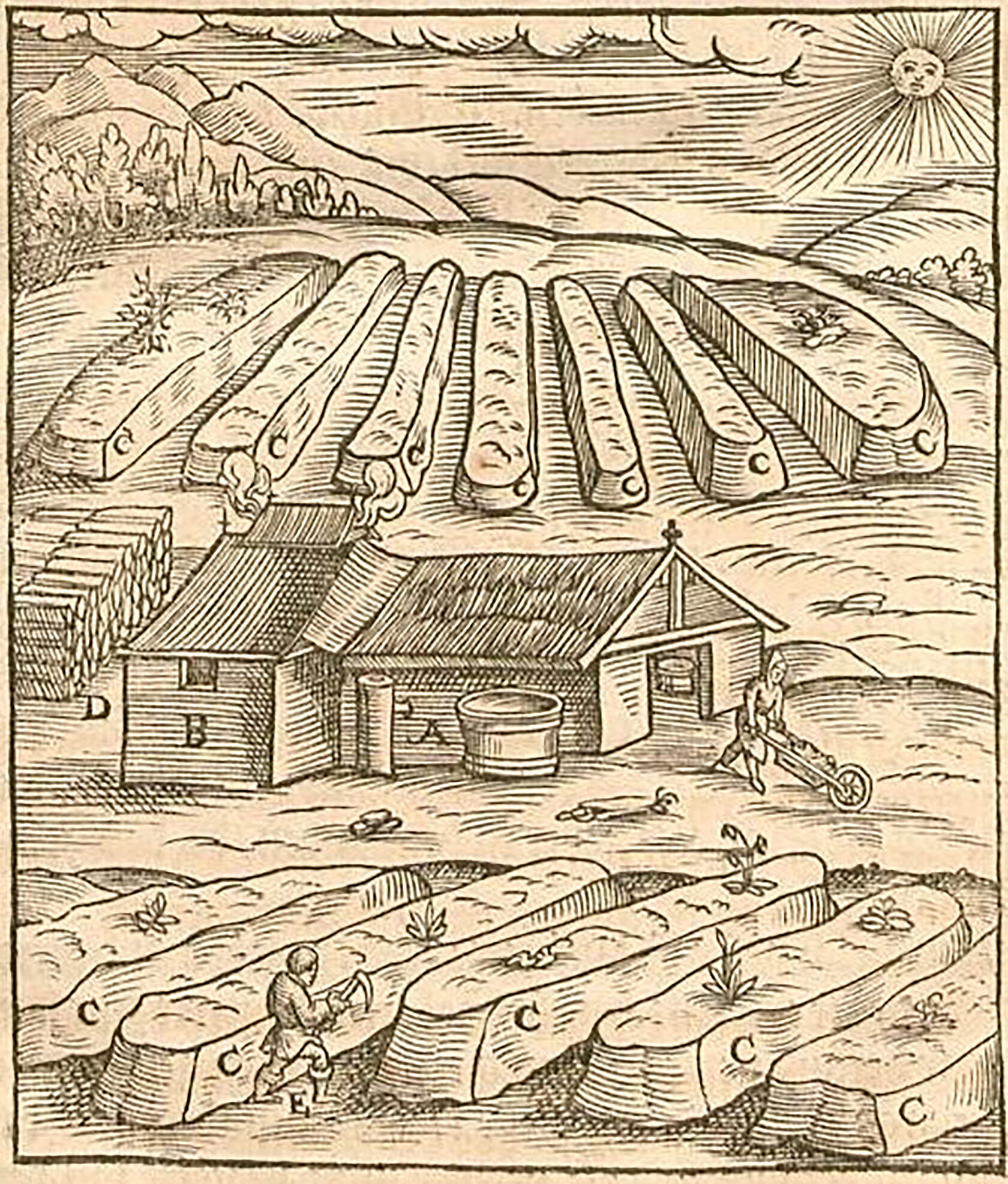 Saltpetre plantation with nitre beds (C) and saltpetre boiling plant (A). Woodcut from Beschreibung aller fürnemisten Mineralischen Ertzt vnnd Berckwercksarten by Lazarus Ercker, Germany, 1580.
