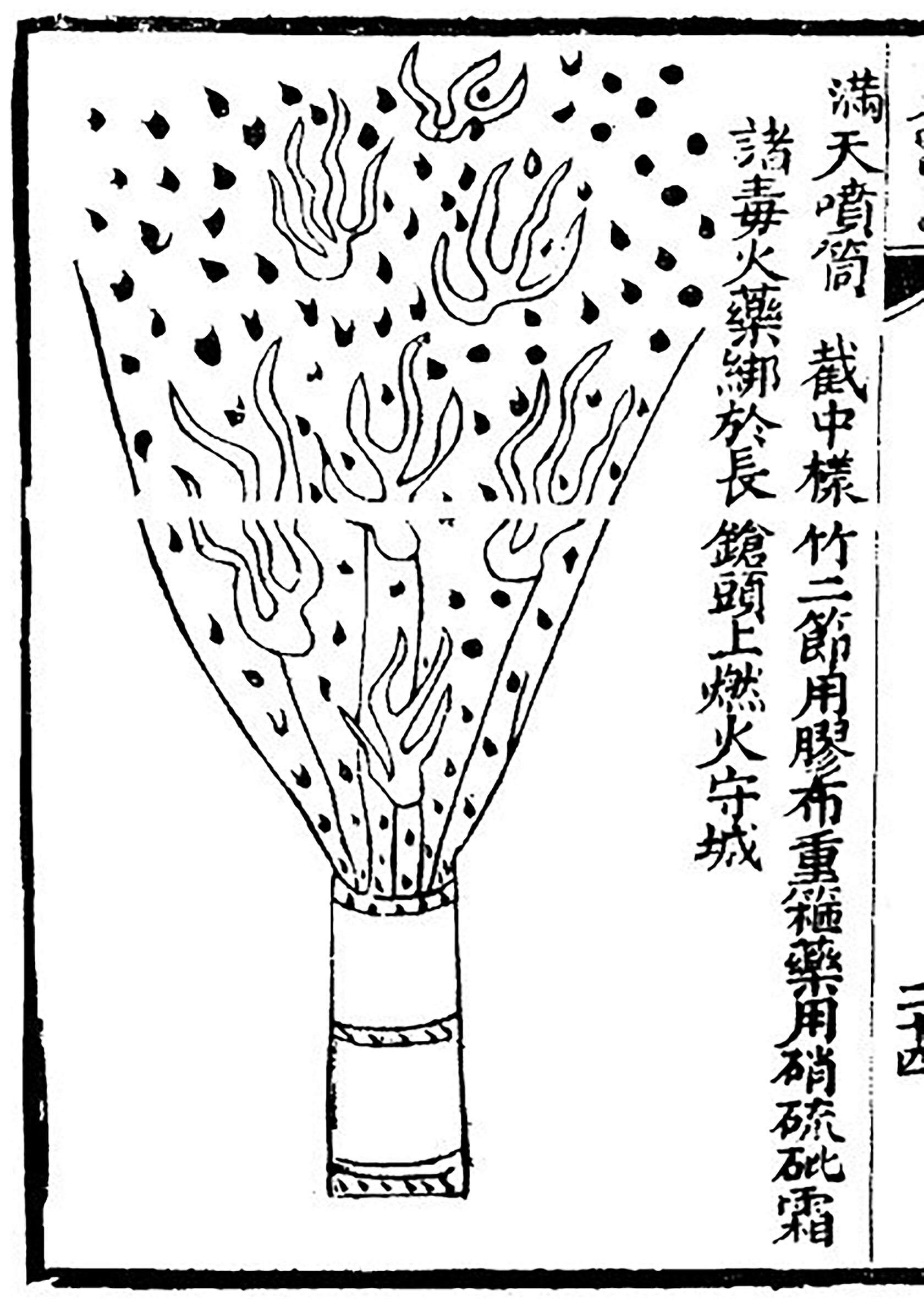 滿天噴筒 - a "sky-filling spurting tube" (bamboo tube filled with a mixture of black powder and porcelain pieces), illustration in the Huolongjing (火龍經), published by Jiao Yu and Liu Bowen, China, 14th century.