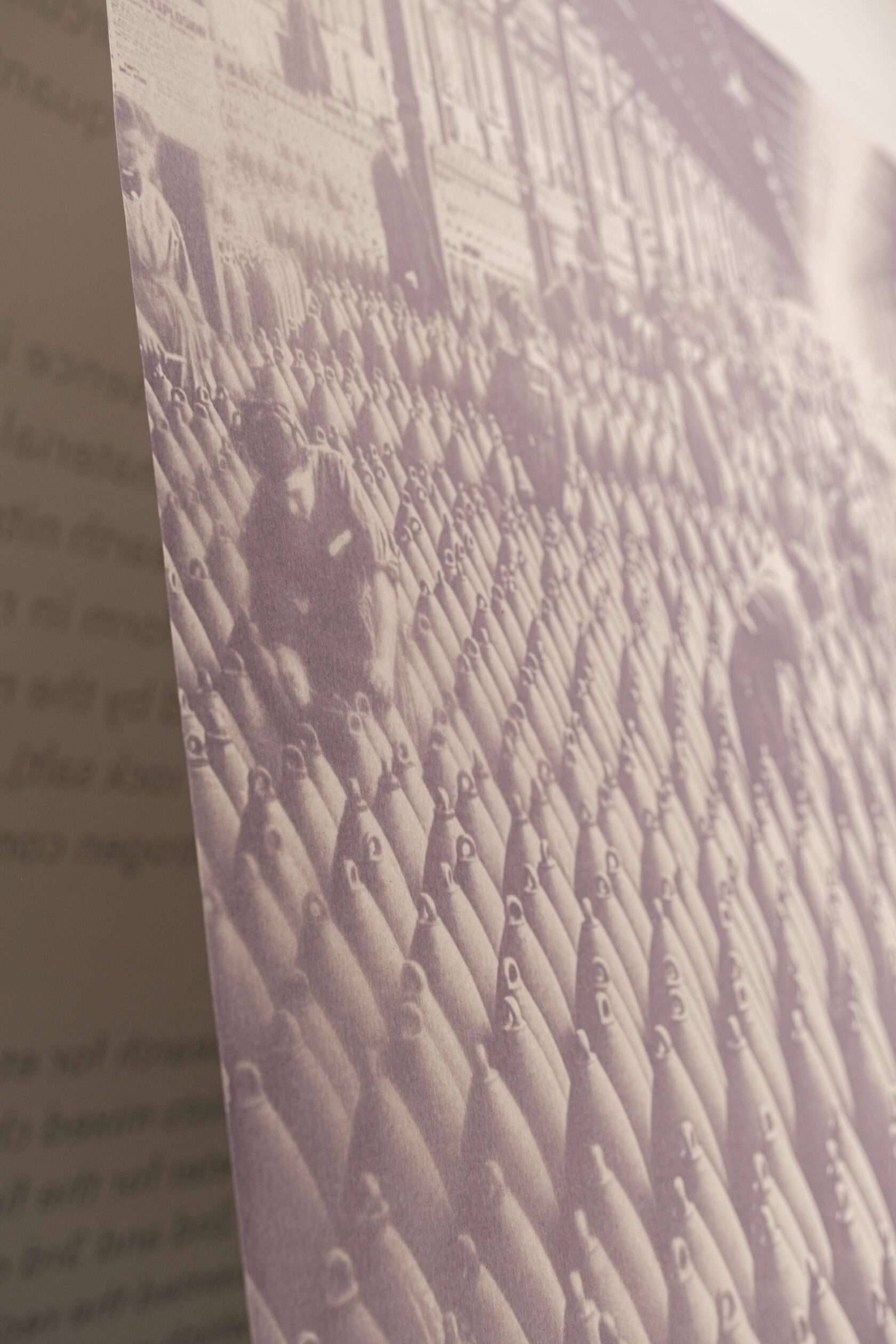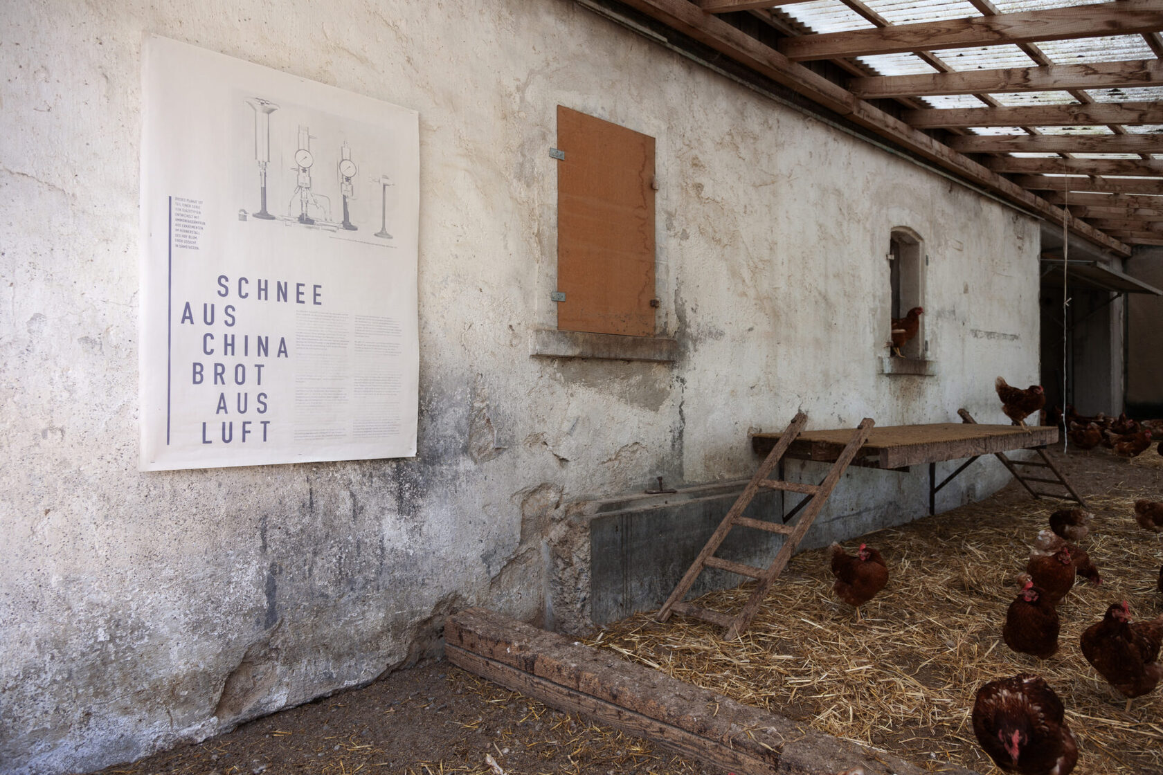In the frame of their research, Willimann/Arai have deconstructed the reproduction process of the diazotype copying machine and reappropriated it through labor-intensive manual methods using sustainable resources. They utilized sunlight for exposure and developed the images within a chicken barn, harnessing naturally occurring ammonia vapors from excrement for the development process. This manual process inevitably led to imperfections in the prints, which – as opposed to the desired accuracy of machine-made copies – resulted in the uniqueness of each copy. Documents reproduced by the diazotype process are not permanently durable – they fade over time when exposed to the daylight. Willimann/Arai are interested in this impermanence, which exposes these products of technological progress as unstable and unsustainable - and thus, in a metaphorical sense, the modern ideology of unlimited growth behind them.