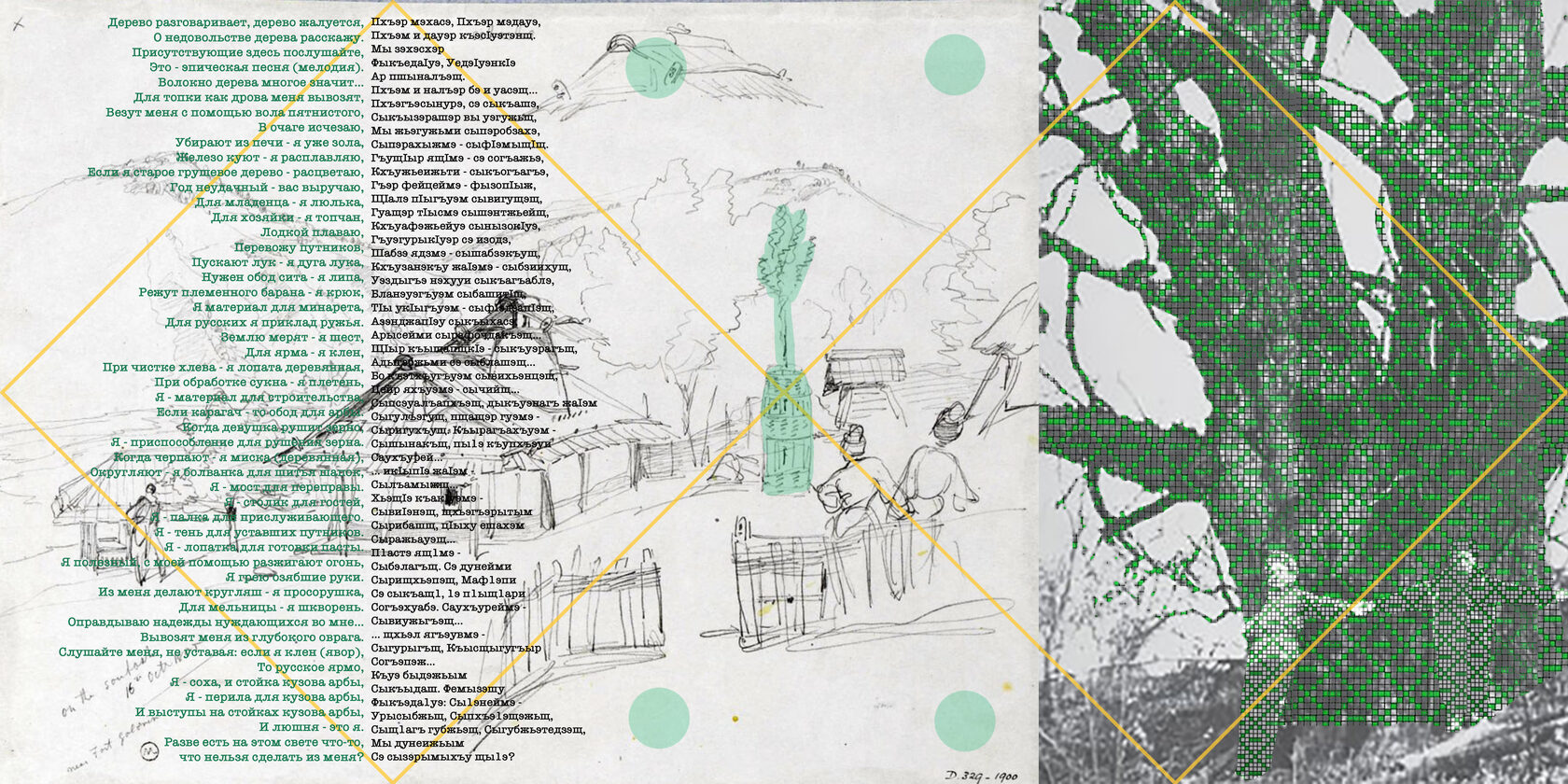 Работа Тхагушева поражает своей скрупулезностью: он пытается восстановить путь российских путешественников конца XIX — начала XX, чтобы обнаружить следы того, что они видели, или найти подтверждение описанных ими практик. Например, руководствуясь данными И.С. Хатисова («Бабуков аул... покрыт прекрасными пашнями и фруктовыми деревьями: яблонями, грушами, черешнями...»), он попадает в аул в 1953 году и обнаруживает там те же деревья, что видел Хатисов: «Поражает то, что хотя этим деревьям более 80-100 лет, они совершенно здоровы и дают обильный урожай» [Тхагушев Н., 2008]. Хатисов пишет об ореховой аллее в урочище Гастагакей, и Нух находит эту аллею.